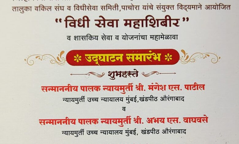 पाचोरा वकील संघ यांच्या संयुक्त विद्यमाने विधी सेवा महाशिबीर, शासकीय सेवा योजना महामेळाव्याचे आयोजन..