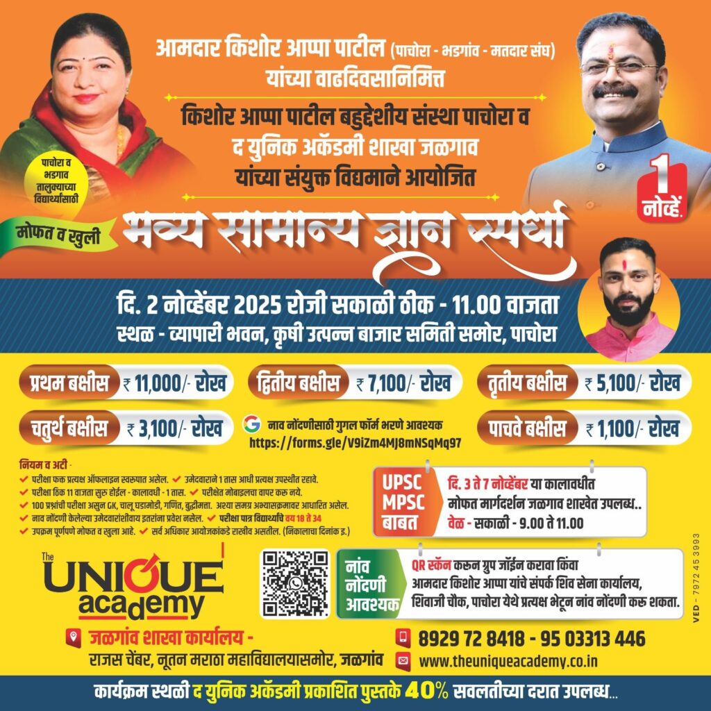 पाचोरा भडगाव विधानसभेचे लोकप्रिय आमदार किशोर आप्पा पाटील यांच्या वाढदिवसाचे औचित्य साधून  किशोर आप्पा पाटील बहुउद्देशीय संस्था पाचोरा तसेच द युनिक अकॅडमी शाखा जळगांव यांच्या संयुक्त विद्यमाने पाचोरा-भडगाव तालुक्यातील विद्यार्थ्यांसाठी मोफत व खुली सामान्य ज्ञान स्पर्धा, रविवार दिनांक 2 नोव्हेंबर 2025 सकाळी 11 वाजता कृषी उत्पन्न बाजार समिती समोर व्यापारी भवन पाचोरा येथे आयोजित करण्यात आली आहे.