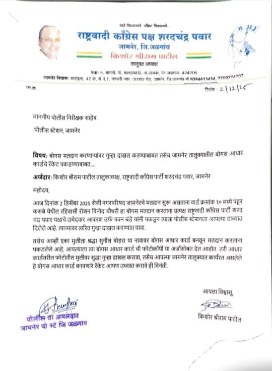 किशोर पाटील यांनी आपल्या तक्रारीत बोगस मतदान, खोटे दस्तऐवज तयार करणे व मतदार याद्यांच्या गैरवापरासंदर्भात सखोल चौकशीची मागणी केली आहे. तसेच जामनेर तालुक्यात कार्यरत असलेल्या बोगस आधार कार्ड तयार करणाऱ्या रॅकेटची उच्चस्तरीय चौकशी करून ते उध्वस्त करण्याची मागणीही त्यांनी केली आहे.निवडणूक प्रक्रियेची पवित्रता आणि मतदारांचा विश्वास टिकवण्यासाठी निवडणूक आयोग व पोलीस प्रशासनाने तातडीने कठोर कारवाई करावी, अशी जोरदार मागणी करण्यात आली आहे. या प्रकरणामुळे जामनेर नगरपरिषद निवडणूक चांगलीच वादाच्या भोवऱ्यात सापडली असून, प्रशासन पुढे काय पावले उचलते याकडे सर्वांचे लक्ष लागले आहे.