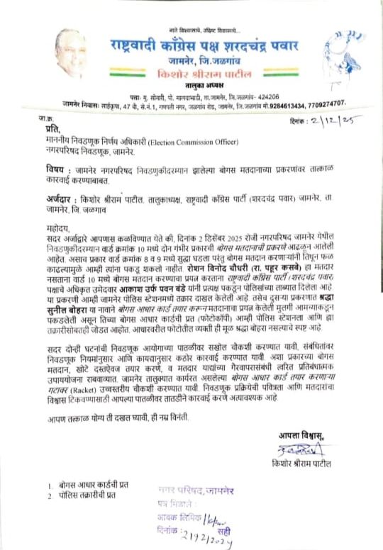 जामनेर नगरपरिषद निवडणुकीदरम्यान गंभीर स्वरूपाचा प्रकार उघडकीस आल्याने खळबळ उडाली आहे. मतदानाच्या दिवशीच वार्ड क्रमांक १० मध्ये बोगस मतदानाचे दोन स्पष्ट प्रकार समोर आले असून, याप्रकरणी राष्ट्रवादी काँग्रेस पक्ष (शरदचंद्र पवार)चे तालुकाध्यक्ष किशोर श्रीराम पाटील यांनी निवडणूक निर्णय अधिकारी तसेच जामनेर पोलीस स्टेशन येथे स्वतंत्र तक्रारी दाखल केल्या आहेत. या प्रकारामुळे संपूर्ण निवडणूक प्रक्रियेच्या पारदर्शकतेवर प्रश्नचिन्ह निर्माण झाले आहे.