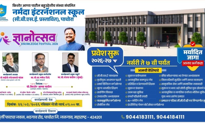 किशोर आप्पा पाटील बहुउद्देशीय संस्था संचलित नर्मदा इंटरनॅशनल स्कूल (सीबीएसई प्रस्तावित), पाचोरा येथे प्रवेश प्रक्रियेच्या पार्श्वभूमीवर ‘ज्ञानोत्सव – नॉलेज फेस्टिव्हल २०२६’ या कार्यक्रमाचे आयोजन करण्यात आले आहे. हा कार्यक्रम रविवार, दि. २२ मार्च २०२६ रोजी सायंकाळी ५ वाजता भडगाव रोडवरील अंतुर्ली फाट्याजवळील शाळेच्या परिसरात होणार आहे.