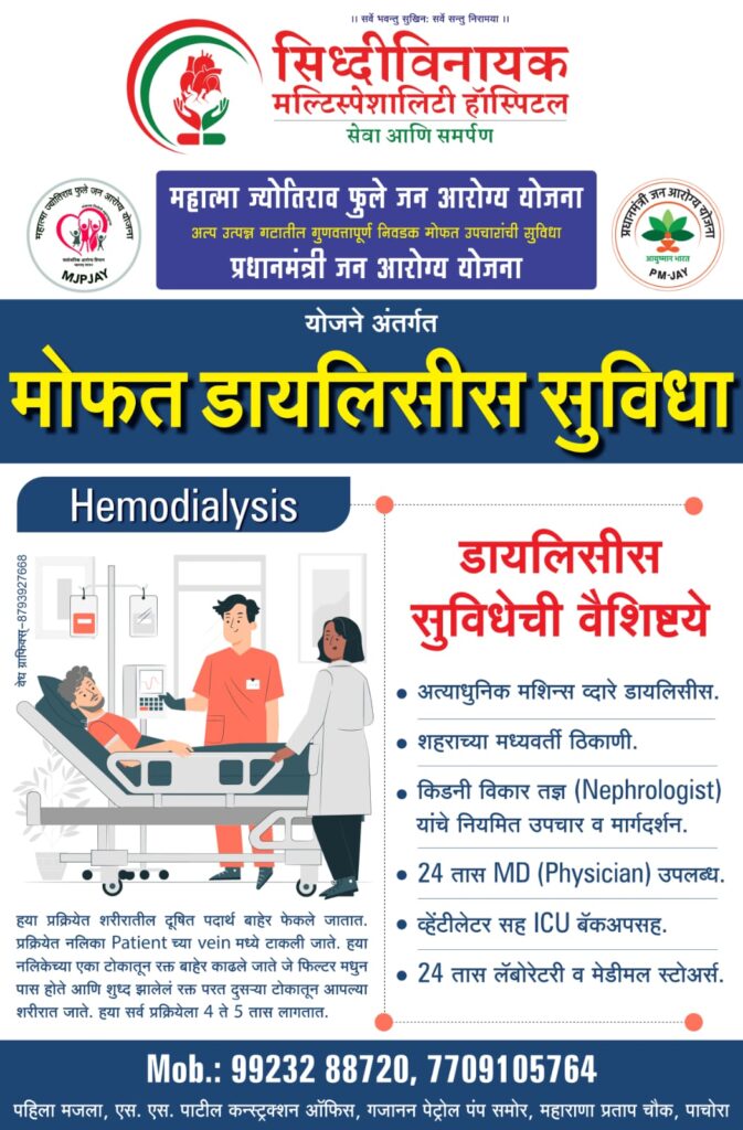 पाचोरा येथे गेल्या पाच वर्षांपासून ‘सेवा आणि समर्पण’ या उदात्त हेतूने रुग्णसेवा करून प्रामाणिक व विश्वसनीय रुग्णसेवा सिद्धीस नेणाऱ्या “सिद्धिविनायक मल्टीस्पेशालिटी हॉस्पिटल” मध्ये महात्मा ज्योतिराव फुले व पंतप्रधान जन आरोग्य योजनेची सुविधा आता उपलब्ध झाली असून या योजने अंतर्गत किडनी विकार असलेल्या रुग्णांसाठी मोफत डायलिसिस सुविधेची सुरुवात झालेली आहे.